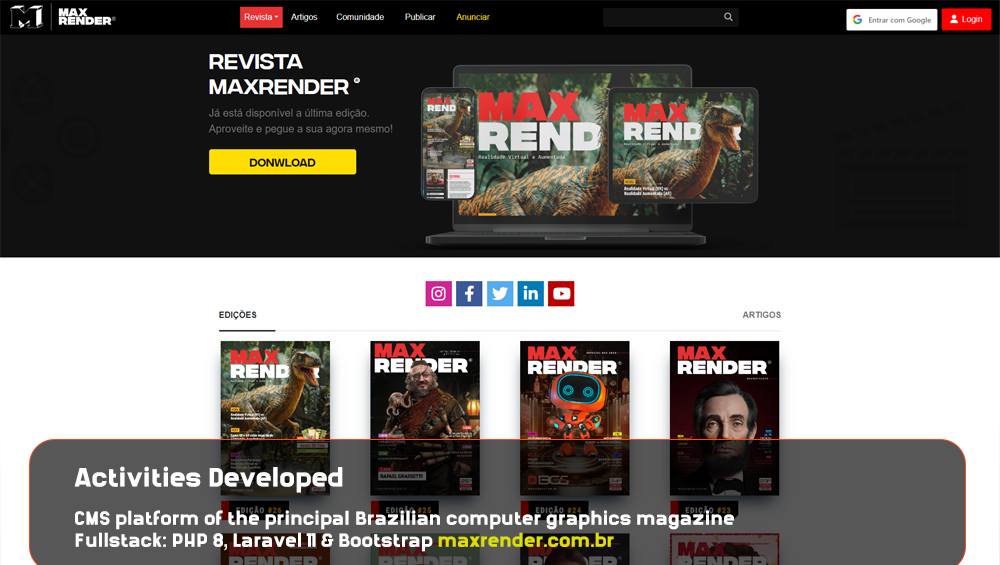 MaxRender is the main Brazilian computer graphics magazine with an exclusive focus on high quality national projects and the only one to promote national and international networking among its readers.